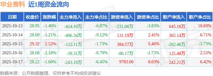 资金流向数据方面,本周华业香料主力资金合计净流出1315.04万元,游资资金合计净流入199.57万元,散户资金合计净流入1115.47万元。本周资金流向一览见下表: