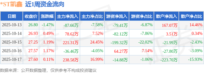 资金流向数据方面,本周*ST凯鑫主力资金合计净流入414.39万元,游资资金合计净流出311.46万元,散户资金合计净流出102.93万元。本周资金流向一览见下表: