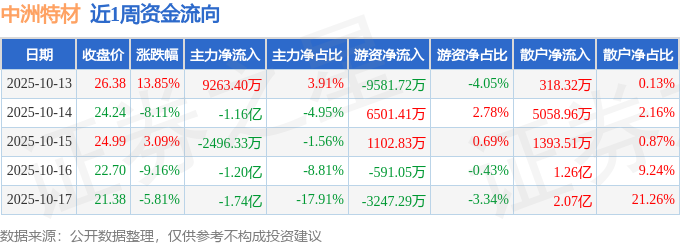 资金流向数据方面,本周中洲特材主力资金合计净流出3.42亿元,游资资金合计净流出5815.82万元,散户资金合计净流入4.01亿元。本周资金流向一览见下表: