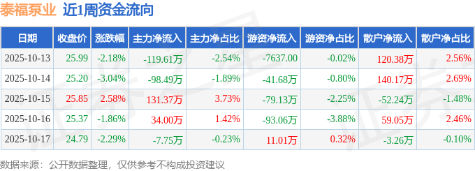 资金流向数据方面,本周泰福泵业主力资金合计净流出60.49万元,游资资金合计净流出203.62万元,散户资金合计净流入264.11万元。本周资金流向一览见下表: