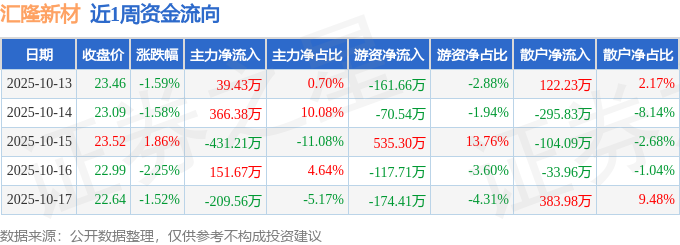 资金流向数据方面,本周汇隆新材主力资金合计净流出83.3万元,游资资金合计净流入10.97万元,散户资金合计净流入72.33万元。本周资金流向一览见下表: