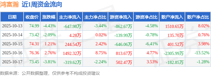 资金流向数据方面,本周鸿富瀚主力资金合计净流入773.55万元,游资资金合计净流出332.57万元,散户资金合计净流出440.97万元。本周资金流向一览见下表: