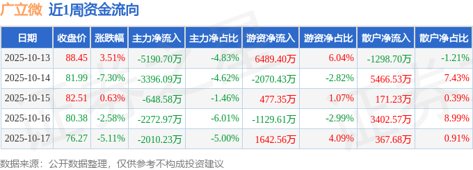 资金流向数据方面,本周广立微主力资金合计净流出1.35亿元,游资资金合计净流入5409.27万元,散户资金合计净流入8109.3万元。本周资金流向一览见下表: