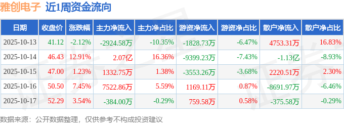 资金流向数据方面,本周雅创电子主力资金合计净流入2.62亿元,游资资金合计净流出1.29亿元,散户资金合计净流出1.34亿元。本周资金流向一览见下表: