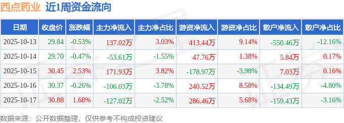 资金流向数据方面,本周西点药业主力资金合计净流入22.29万元,游资资金合计净流入809.21万元,散户资金合计净流出831.5万元。本周资金流向一览见下表: