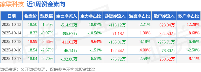 资金流向数据方面,本周家联科技主力资金合计净流出737.91万元,游资资金合计净流出132.14万元,散户资金合计净流入870.05万元。本周资金流向一览见下表: