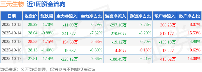 资金流向数据方面,本周三元生物主力资金合计净流出343.11万元,游资资金合计净流出770.97万元,散户资金合计净流入1114.08万元。本周资金流向一览见下表: