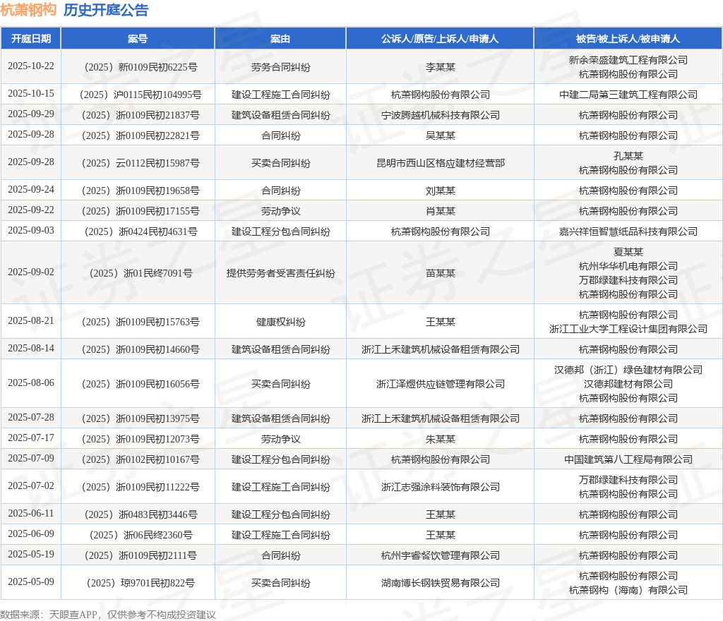 案号:(2025)新0109民初6225号根据统计,近一年内以杭萧钢构股份有限公司为当事人的历史开庭公告有30则,其中案由为“合同纠纷”的公告以4则居首,其次为“建筑设备租赁合同纠纷”有4则,“建设工程分包合同纠纷”有4则。历史开庭公告(前20条)如下: