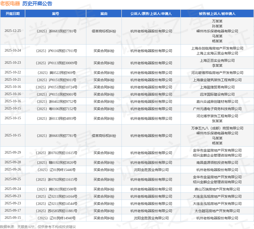 案号:(2025)冀0522民初969号根据统计,近一年内以杭州老板电器股份有限公司为当事人的历史开庭公告有227则,其中案由为“买卖合同纠纷”的公告以145则居首,其次为“侵害商标权纠纷”有46则,“承揽合同纠纷”有5则。历史开庭公告(前20条)如下: