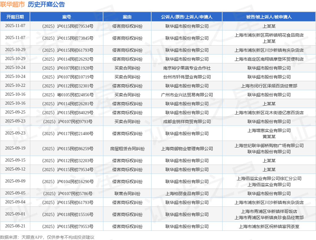 案号:(2025)沪0112民初32301号根据统计,近一年内以联华超市股份有限公司为当事人的历史开庭公告有119则,其中案由为“侵害商标权纠纷”的公告以65则居首,其次为“买卖合同纠纷”有11则,“商标权权属、侵权纠纷”有10则。历史开庭公告(前20条)如下: