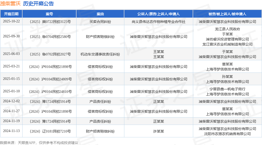 案号:(2025)冀0722民初3125号根据统计,近一年内以潍柴雷沃智慧农业科技股份有限公司为当事人的历史开庭公告有10则,其中案由为“侵害商标权纠纷”的公告以4则居首,其次为“产品责任纠纷”有2则,“财产损害赔偿纠纷”有2则。历史开庭公告如下: