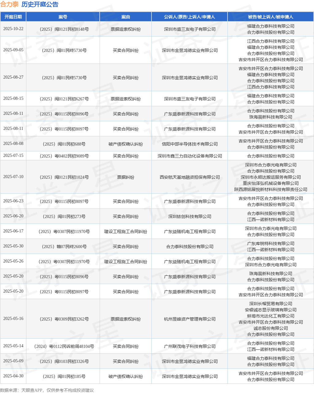 案号:(2025)闽0121民初8148号根据统计,近一年内以合力泰科技股份有限公司为当事人的历史开庭公告有55则,其中案由为“买卖合同纠纷”的公告以22则居首,其次为“票据追索权纠纷”有11则,“票据纠纷”有10则。历史开庭公告(前20条)如下: