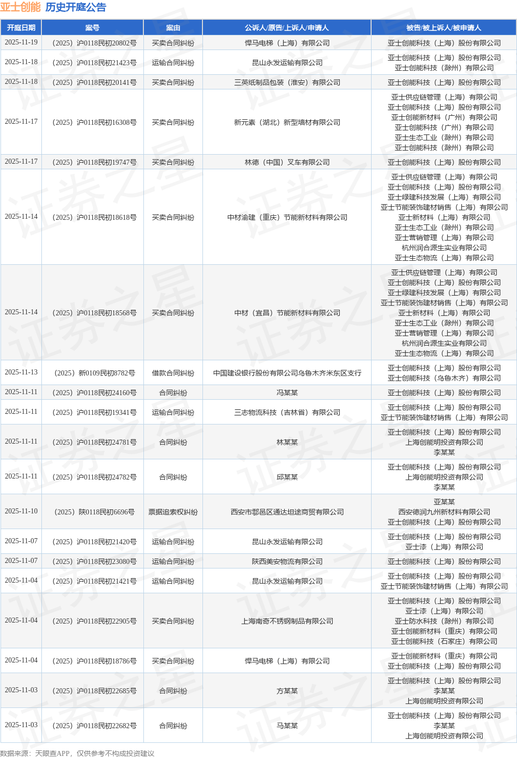 案号:(2025)沪0118民初21841号根据统计,近一年内以亚士创能科技(上海)股份有限公司为当事人的历史开庭公告有130则,其中案由为“买卖合同纠纷”的公告以38则居首,其次为“运输合同纠纷”有21则,“合同纠纷”有17则。历史开庭公告(前20条)如下: