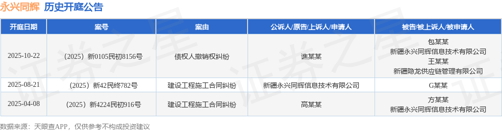 证券之星消息,根据天眼查APP显示,近日公布了一则新疆永兴同辉信息技术有限公司作为被告/被上诉人的开庭公告,详细内容如下: