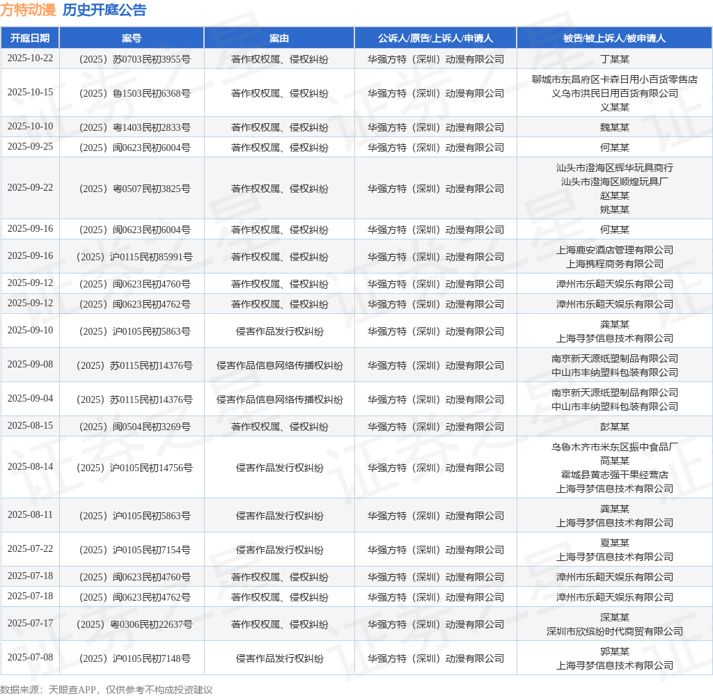 案号:(2025)苏0703民初3955号根据统计,近一年内以华强方特(深圳)动漫有限公司为当事人的历史开庭公告有99则,其中案由为“著作权权属、侵权纠纷”的公告以74则居首,其次为“侵害作品发行权纠纷”有9则,“侵害作品信息网络传播权纠纷”有5则。历史开庭公告(前20条)如下: