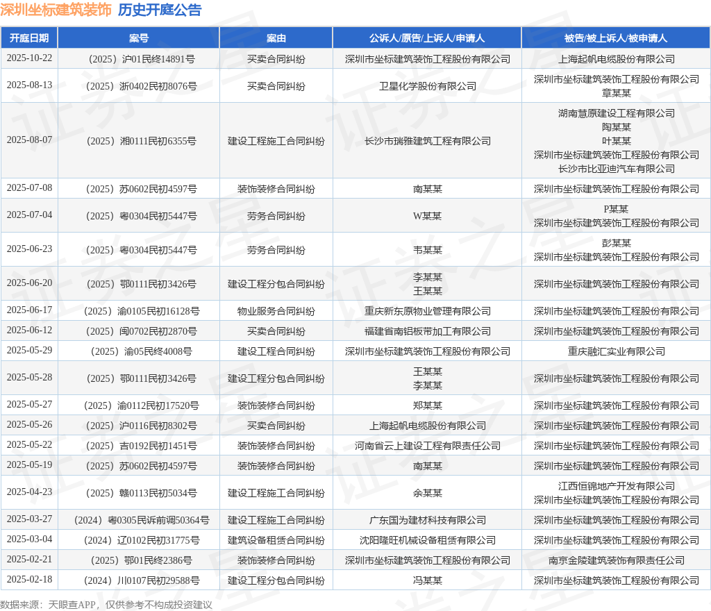 案号:(2025)沪01民终14891号根据统计,近一年内以深圳市坐标建筑装饰工程股份有限公司为当事人的历史开庭公告有29则,其中案由为“装饰装修合同纠纷”的公告以9则居首,其次为“建设工程施工合同纠纷”有5则,“买卖合同纠纷”有4则。历史开庭公告(前20条)如下: