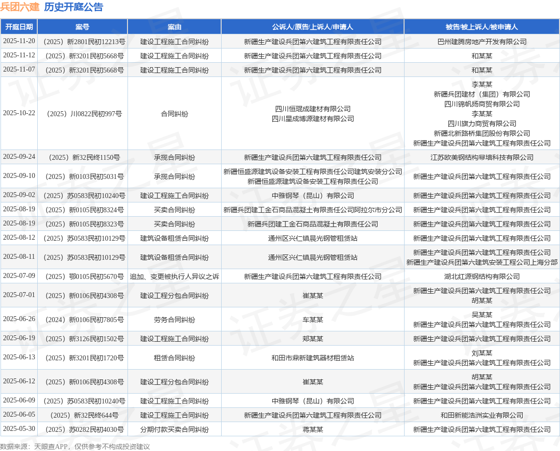 证券之星消息,根据天眼查APP显示,近日公布了一则新疆生产建设兵团第六建筑工程有限责任公司作为被告/被上诉人的开庭公告,详细内容如下: