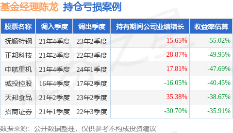 陈龙管理的国防LOF基金在21年4季度买入抚顺特钢,在持有1年又2个季度后在23年2季度卖出。持有期间的估算收益率为-55.02%,持有期间抚顺特钢在2021年到2023年的年报营业总收入增幅达15.65%。