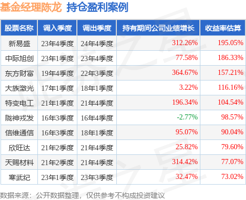 陈龙管理的鹏华中证500ETF基金在23年4季度买入新易盛,在持有1年又0个季度后在24年4季度卖出。持有期间的估算收益率为195.05%,持有期间新易盛在2023年到2024年的年报归属净利润增幅达312.26%。