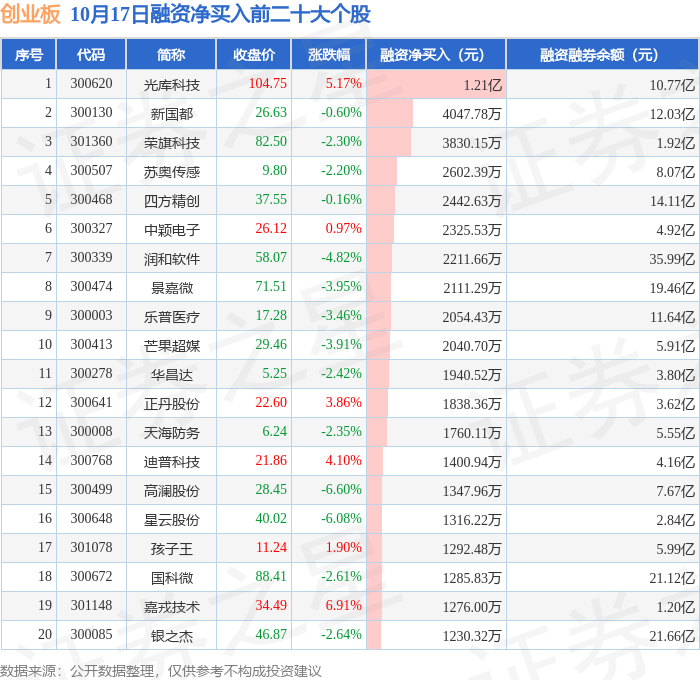 创业板融资净买入前三分别为:光库科技(300620)融资净买入1.21亿元、新国都(300130)融资净买入4047.78万元、荣旗科技(301360)融资净买入3830.15万元,前20具体见下表: