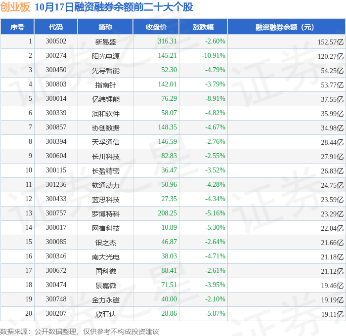 创业板融资融券余额前三分别为:新易盛(300502)融资融券余额152.57亿元、阳光电源(300274)融资融券余额120.27亿元、先导智能(300450)融资融券余额54.25亿元,前20具体见下表: