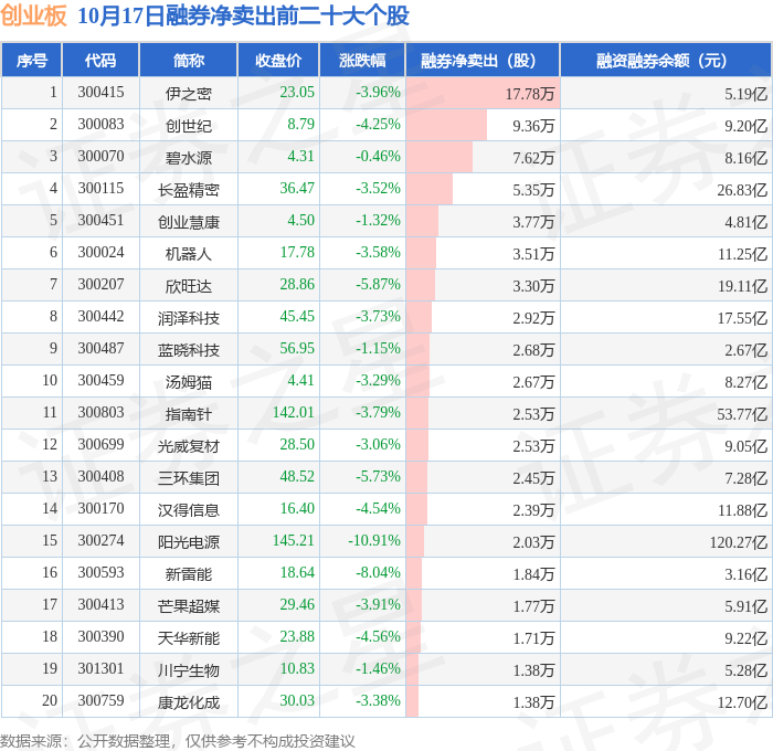 创业板融券净卖出前三分别为:伊之密(300415)融券净卖出17.78万股、创世纪(300083)融券净卖出9.36万股、碧水源(300070)融券净卖出7.62万股,前20具体见下表: