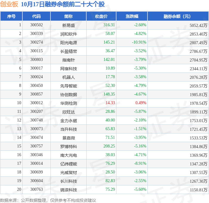 创业板融券余额前三分别为:新易盛(300502)融券余额5052.42万元、润和软件(300339)融券余额2853.4万元、阳光电源(300274)融券余额2807.49万元,前20具体见下表: