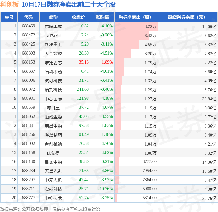 科创板融券净卖出前三分别为:芯联集成(688469)融券净卖出8.22万股、阿特斯(688472)融券净卖出6.42万股、铁建重工(688425)融券净卖出4.55万股,前20具体见下表: