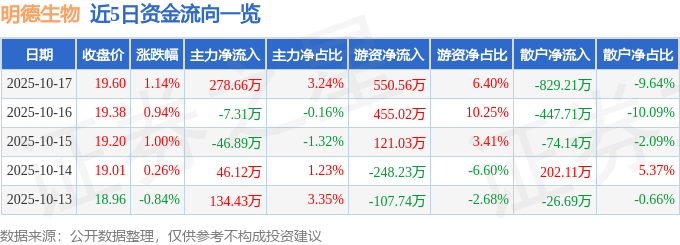 证券之星消息,截至2025年10月17日收盘,明德生物(002932)报收于19.6元,上涨1.14%,换手率2.82%,成交量4.4万手,成交额8600.76万元。