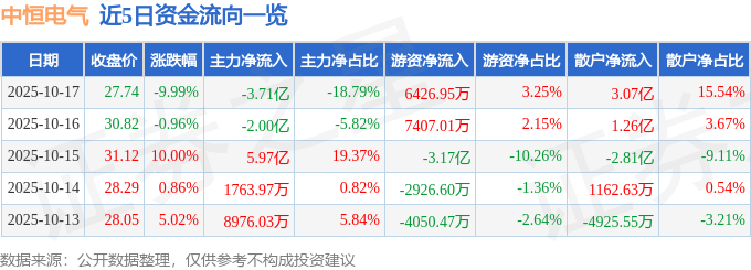 证券之星消息,截至2025年10月17日收盘,中恒电气(002364)报收于27.74元,下跌9.99%,跌停,换手率12.43%,成交量69.36万手,成交额19.75亿元。