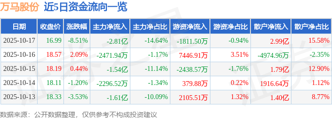 证券之星消息,截至2025年10月17日收盘,万马股份(002276)报收于16.99元,下跌8.51%,换手率10.87%,成交量109.51万手,成交额19.2亿元。