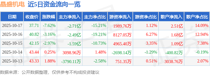 10月17日的资金流向数据方面,主力资金净流出2.71亿元,占总成交额15.21%,游资资金净流入1989.76万元,占总成交额1.12%,散户资金净流入2.51亿元,占总成交额14.09%。