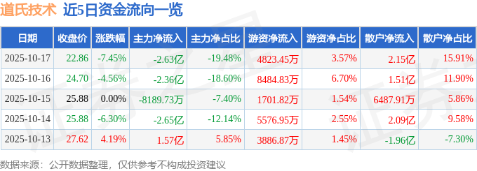 证券之星消息,截至2025年10月17日收盘,道氏技术(300409)报收于22.86元,下跌7.45%,换手率8.33%,成交量57.27万手,成交额13.5亿元。