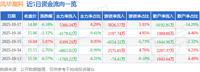 10月17日的资金流向数据方面,主力资金净流入5366.24万元,占总成交额8.29%,游资资金净流入3826.57万元,占总成交额5.91%,散户资金净流出9192.81万元,占总成交额14.2%。