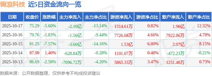证券之星消息,截至2025年10月17日收盘,锦浪科技(300763)报收于75.29元,下跌5.6%,换手率6.47%,成交量20.8万手,成交额15.95亿元。