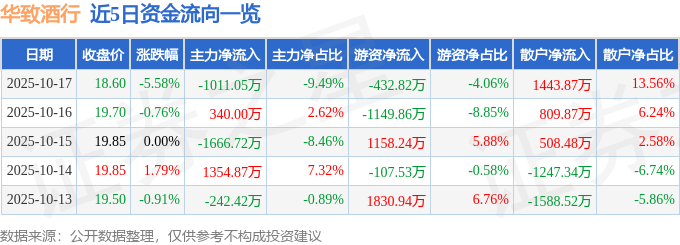 证券之星消息,截至2025年10月17日收盘,华致酒行(300755)报收于18.6元,下跌5.58%,换手率1.34%,成交量5.57万手,成交额1.06亿元。