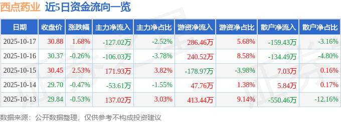 证券之星消息,截至2025年10月17日收盘,西点药业(301130)报收于30.88元,上涨1.68%,换手率2.8%,成交量1.63万手,成交额5044.7万元。