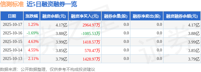 信测标准融资融券信息显示,融资方面,当日融资买入6242.75万元,融资偿还3277.78万元,融资净买入2964.97万元。融券方面,融券卖出0.0股,融券偿还0.0股,融券余量0.0股,融券余额0.0万元。融资融券余额4.17亿元。