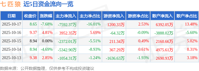 证券之星消息,截至2025年10月17日收盘,七 匹 狼(002029)报收于8.65元,下跌7.68%,换手率7.99%,成交量53.14万手,成交额4.74亿元。