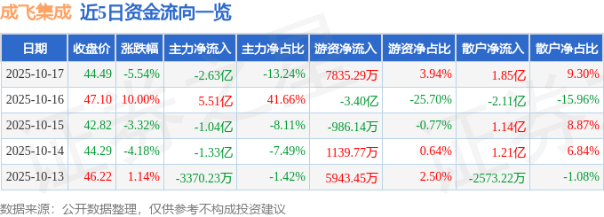 证券之星消息,截至2025年10月17日收盘,成飞集成(002190)报收于44.49元,下跌5.54%,换手率12.18%,成交量43.68万手,成交额19.88亿元。