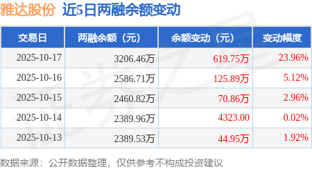 证券之星消息,10月17日,雅达股份(920556)融资买入807.32万元,融资偿还187.57万元,融资净买入619.75万元,融资余额3206.46万元,近3个交易日已连续净买入累计816.5万元。