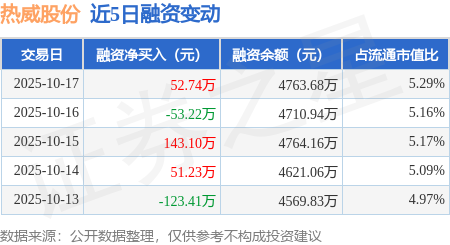 证券之星消息,10月17日,热威股份(603075)融资买入182.52万元,融资偿还129.78万元,融资净买入52.74万元,融资余额4763.68万元。