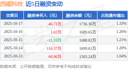 证券之星消息,10月17日,西磁科技(920061)融资买入92.87万元,融资偿还46.16万元,融资净买入46.71万元,融资余额1736.36万元。