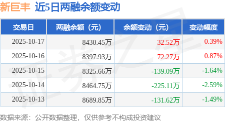 证券之星消息,10月17日,新巨丰(301296)融资买入337.75万元,融资偿还305.23万元,融资净买入32.52万元,融资余额8430.45万元。