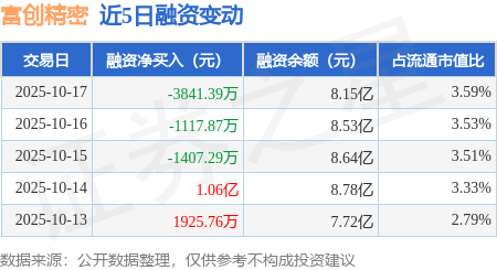 证券之星消息,10月17日,富创精密(688409)融资买入5713.91万元,融资偿还9555.3万元,融资净卖出3841.39万元,融资余额8.15亿元,近20个交易日中有11个交易日出现融资净买入。