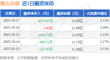 证券之星消息,10月17日,常山北明(000158)融资买入4.25亿元,融资偿还4.71亿元,融资净卖出4579.05万元,融资余额12.03亿元。