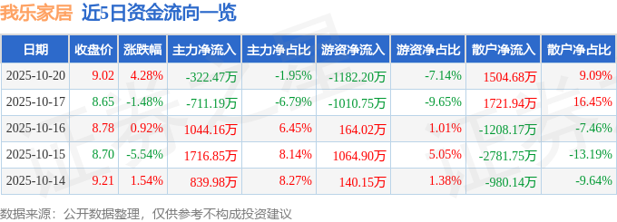证券之星消息,截至2025年10月20日收盘,我乐家居(603326)报收于9.02元,上涨4.28%,换手率5.73%,成交量18.28万手,成交额1.66亿元。
