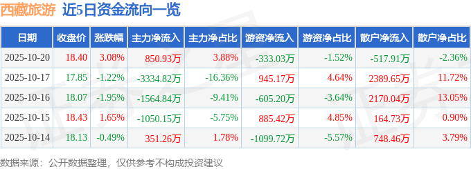 证券之星消息,截至2025年10月20日收盘,西藏旅游(600749)报收于18.4元,上涨3.08%,换手率5.27%,成交量11.97万手,成交额2.19亿元。