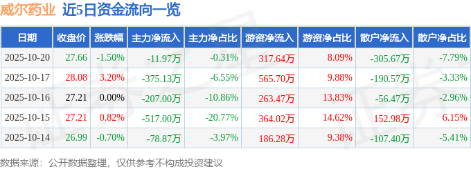 证券之星消息,截至2025年10月20日收盘,威尔药业(603351)报收于27.66元,下跌1.5%,换手率1.04%,成交量1.41万手,成交额3924.57万元。