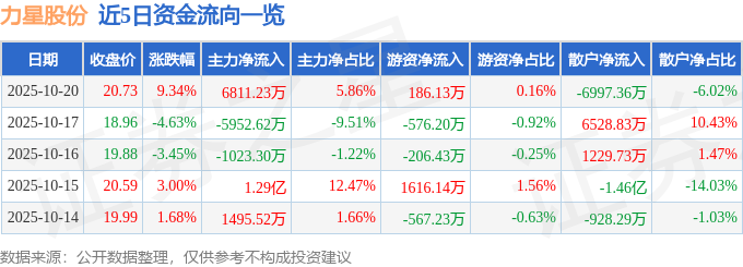 证券之星消息,截至2025年10月20日收盘,力星股份(300421)报收于20.73元,上涨9.34%,换手率24.47%,成交量56.37万手,成交额11.62亿元。